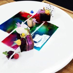 Expertfoods Red Pitaya chocolate Mousse, Red pitaya fluid gel, lemon curd, Rose macaron , Vanilla ice cream.