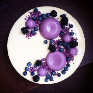 White chocolate and vanilla mousse, chocolate sponge, and blueberry and blackberry panna cotta